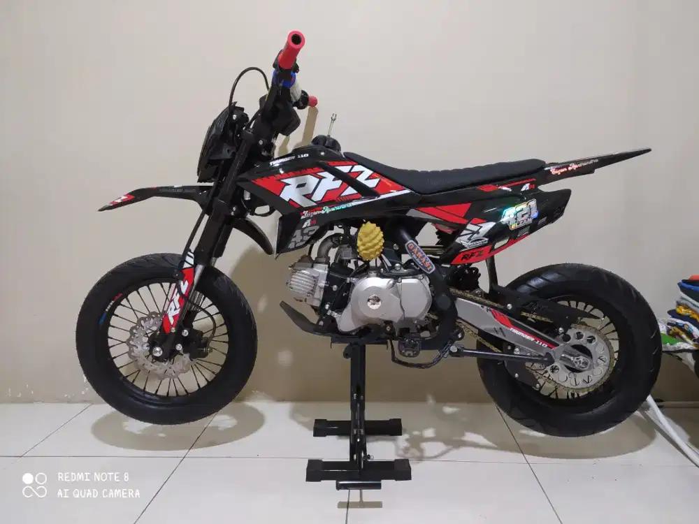 Untuk ban sudah kita ganti dengan modifikasi supermoto baru di pakai 5 bulan dan stang protaper dan handel rem nisin berikut tali rem nya, handgrip modifikasi, berikut saya kasi standar 2 hidrolik, NON BPKB dan STNK
