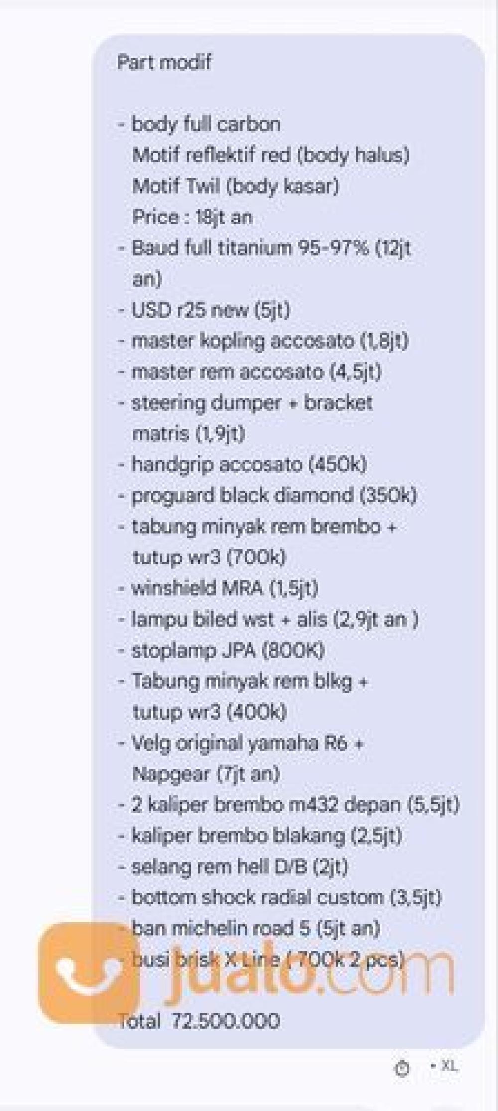 R25 Full Carbon, Perintilan banyak banget jual aja include semuanya... \nPart modif di slide paling akhir + masih ada printilan yang belom ane tulis, buat lengkapnya cek ke rumah aja pokoknya ambil semua. \nPart ori cuma ada tutup tengki sama jok belakang\nSiap nongkrong pokoknya ganteng\nMinat japri aja di 089629731898